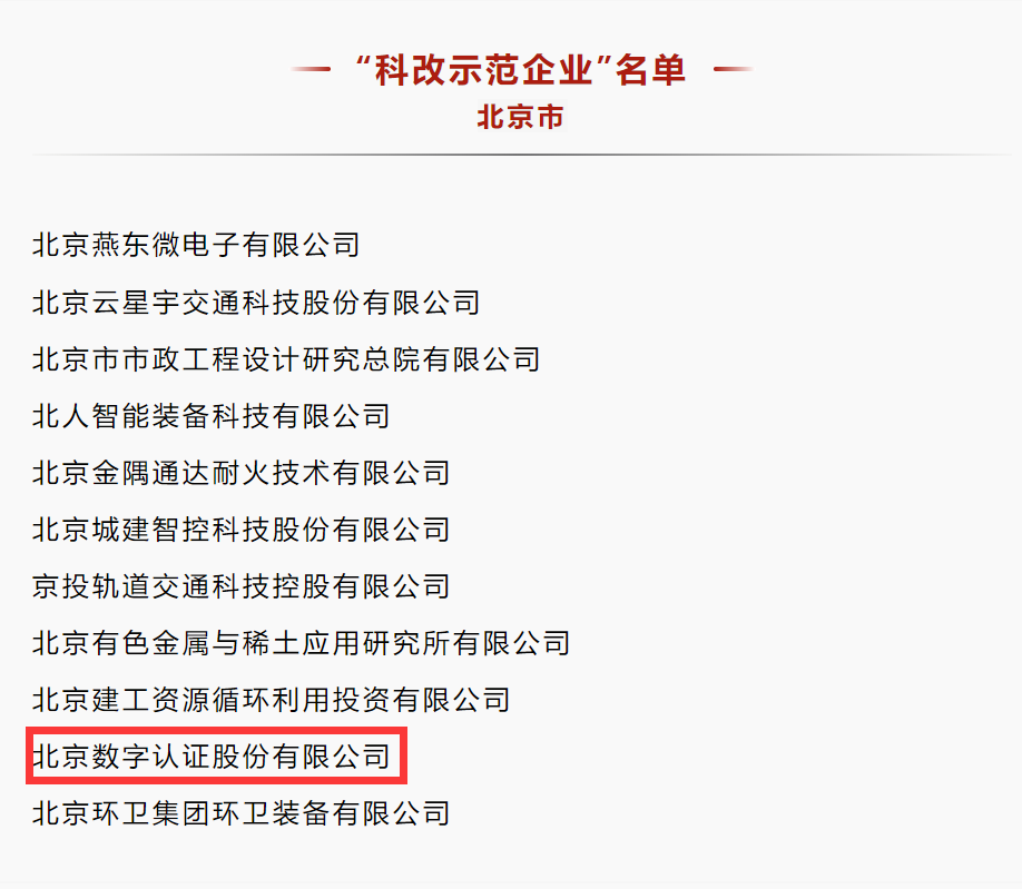 近日,国务院国有企业改革领导小组办公室公布最新“科改示范企业”名单,中国核工业集团有限公司、中国航天科技集团有限公司、国家电网有限公司等共计440家央企、国企上榜。在北京市11家入选企业中,北京数字认证股份有限公司(简称:数字认证)位列其中。