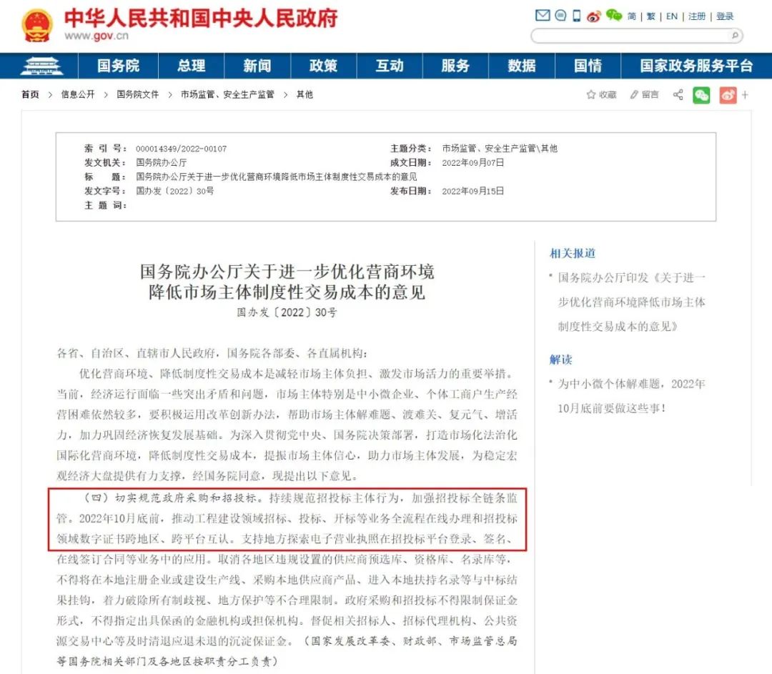 招投标全流程电子化的内涵,不只包含了大家熟知的招标、投标、开标、评标、定标环节,还有合同签订与文件归档等环节,其中合同签订与监管更是公共资源交易重要环节之一。今年9月,国务院印发的《关于进一步优化营商环境降低市场主体制度性交易成本的意见》中明确要求:切实规范政府采购和招投标,10月底前推动工程建设领域招标、投标、开标等业务全流程在线办理和招投标领域数字证书跨地区、跨平台互认。支持地方探索电子营业执照在招投标平台登录、签名、在线签订合同等业务中的应用。