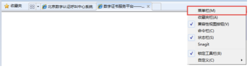 ① 若浏览器中看不到"菜单栏,可手动调出,浏览器选项卡空白处点击鼠标右键,点击"菜单栏",如下图(若浏览器中能显示菜单栏请跳过此步):